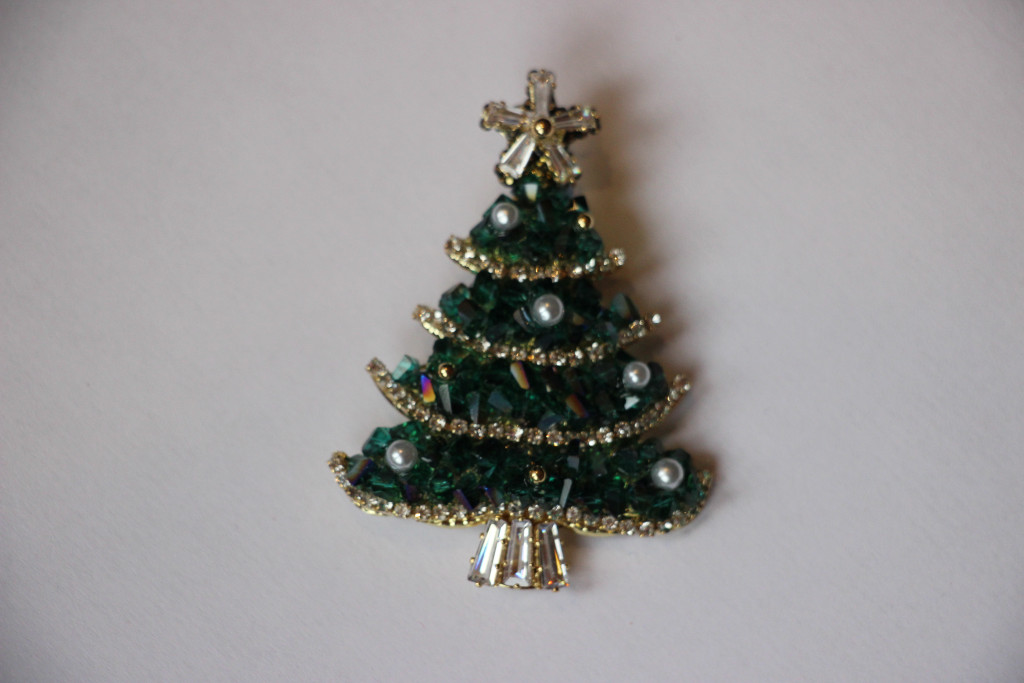Karácsonyfa bross áttetsző cirkónia kristályokkal, gyöngyökkel (0102.)